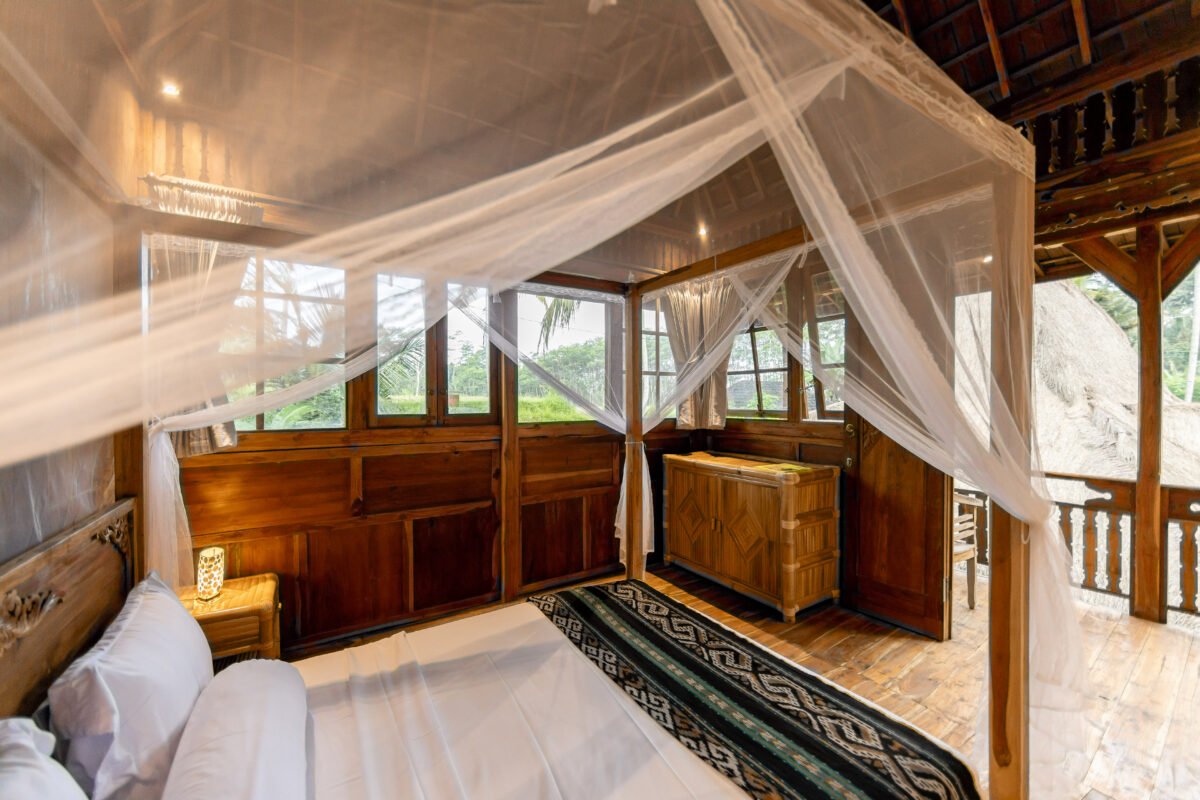 The room, crafted entirely from wood, sits on the second floor, radiating a warm and natural charm. Its balcony offers breathtaking views of lush jungle and sprawling rice fields, immersing you in the beauty of nature. The first floor features an open, airy design, providing versatile space for lounging and other activities, making the entire structure a perfect blend of comfort and tranquility.
